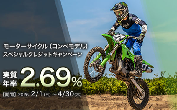 モーターサイクルスペシャルクレジットキャンペーン いまだけ「実質年率2.69%」のスペシャルクレジットをご用意。カワサキモーターサイクルを楽しむチャンス。>